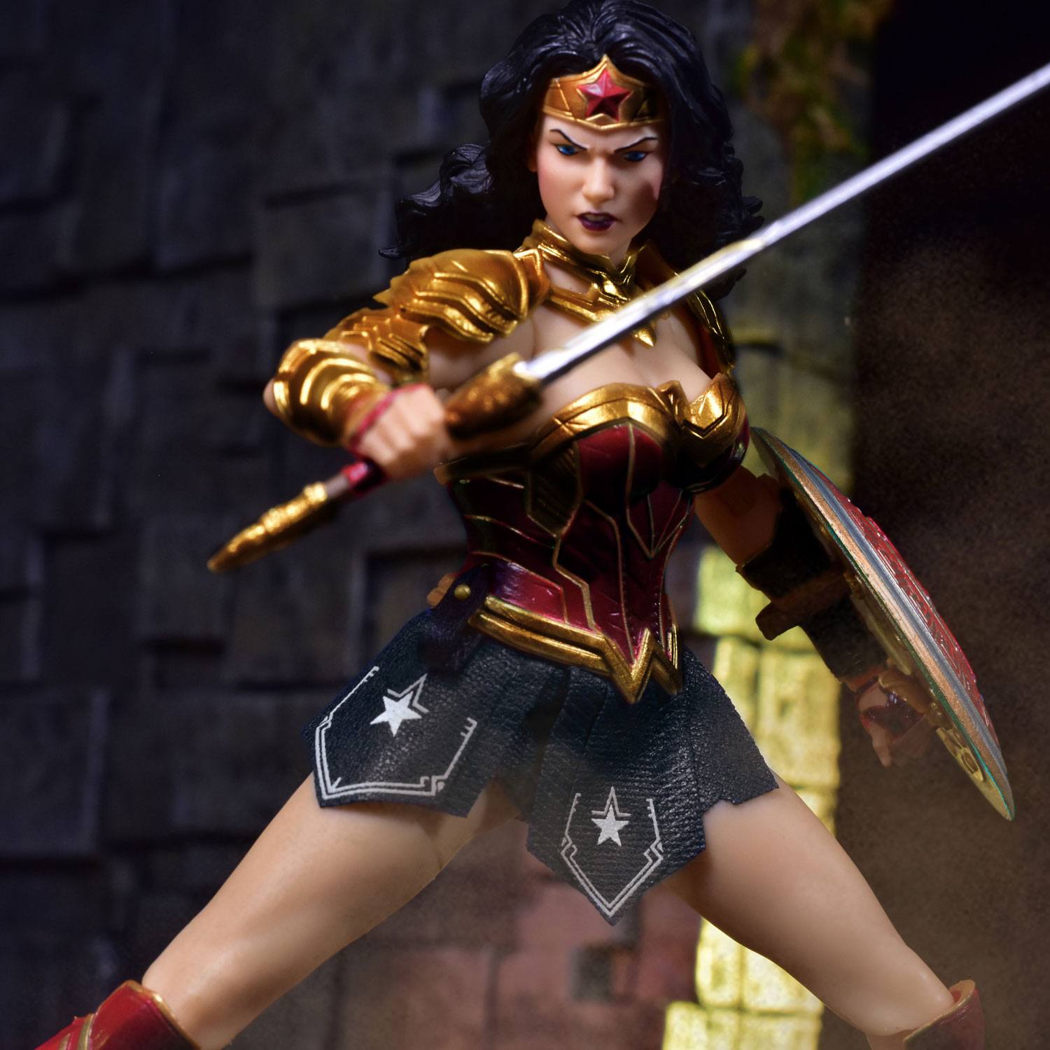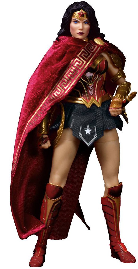 The One:12 Collective Wonder Woman is combat-ready, outfitted in a Themysciran battle suit with removable neck and shoulder armor, worn only by the most elite Amazonian warriors. The fearless demigoddess wears a cape with an integrated posing wire that attaches via a clasp at the neck. Man-made weaponry doesn't stand a chance - bullets ricochet right off her wrist bracelets with the included effects that attach via magnet. Wonder Woman is well-equipped to fight for justice, complete with the Sword of Athena, Lasso of Truth which can be held on her belt, a battle axe, a spear, and a shield.