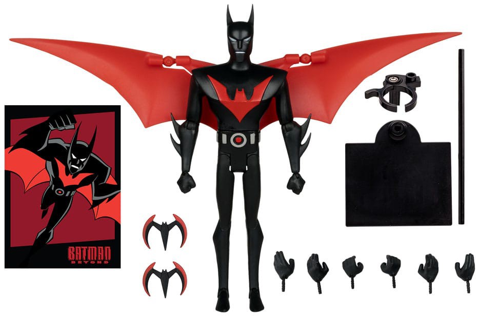 Incredibly detailed 6" scale figure based on the legendary tv series BATMAN BEYOND, Designed with articulation for posing and play. Accessories include detachable wings, 6 extra hands, 2 Batarangs, base and collectible art card.