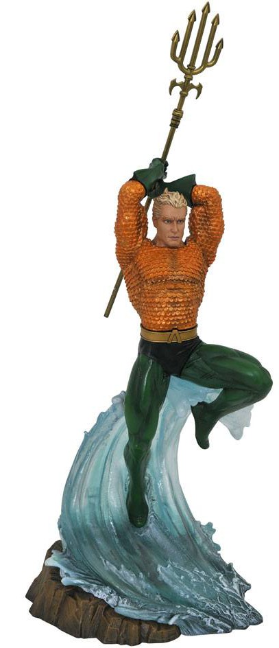How deep is your Gallery? The DC Gallery line of PVC dioramas now adds the King of Atlantis, Aquaman! Springing from the sea with his trident poised to attack, Arthur Curry is the subject of this 9-inch-scale diorama, wearing his classic orange-and-green outfit. Made of a high-quality plastic, and featuring a detailed sculpt and exacting paint applications, it comes packaged in a full-color window box. Hand-sculpted by Jean St. Jean!