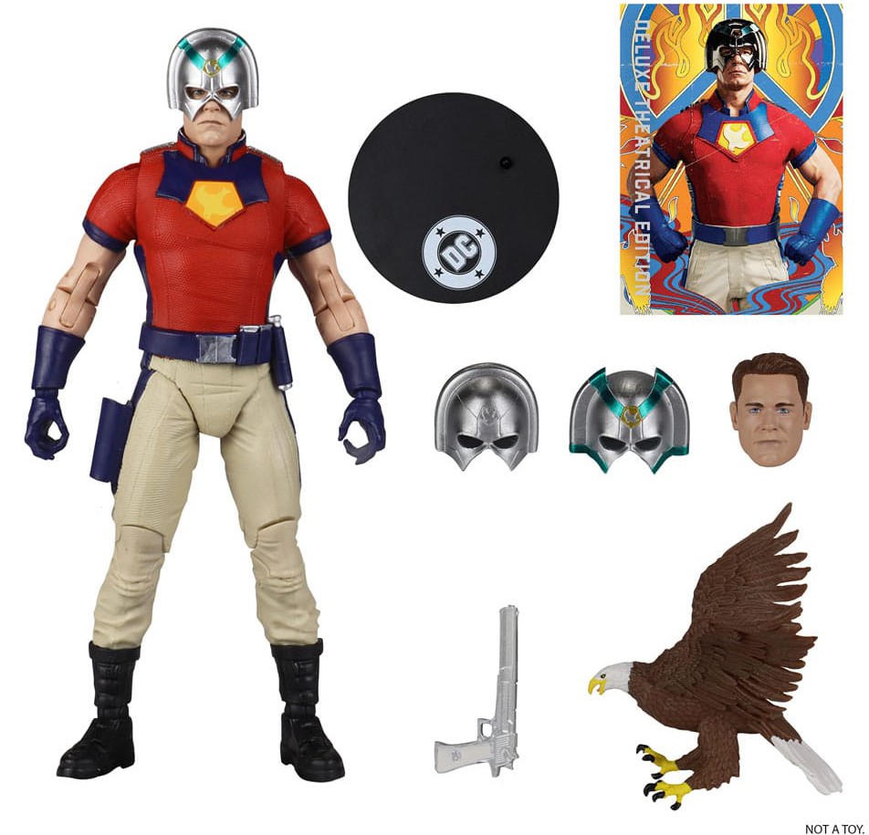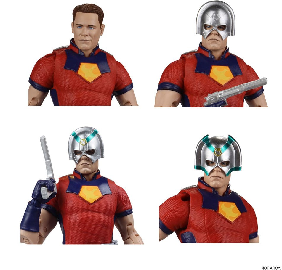 - Accessories include Peacemaker's "big gun", 3 interchangeable helmets, Eagly, unmasked head portrait and figure display base