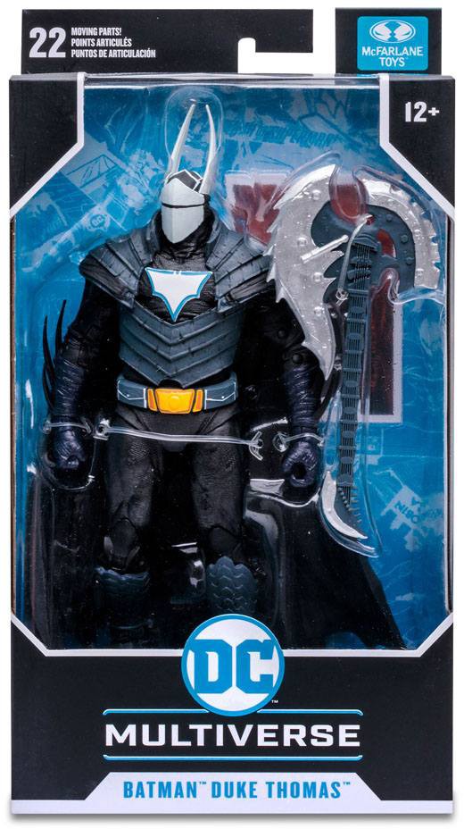 Detaljerad Duke Thomas actionfigur baserad på karaktärens utseende i Tales of the Dark Multiverse från DC Multiverse. Figuren är ca 18 cm hög och fullt ledad med upp till 22 rörliga delar. Kommer med tillbehör i en fönsterkartong.