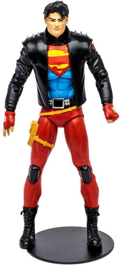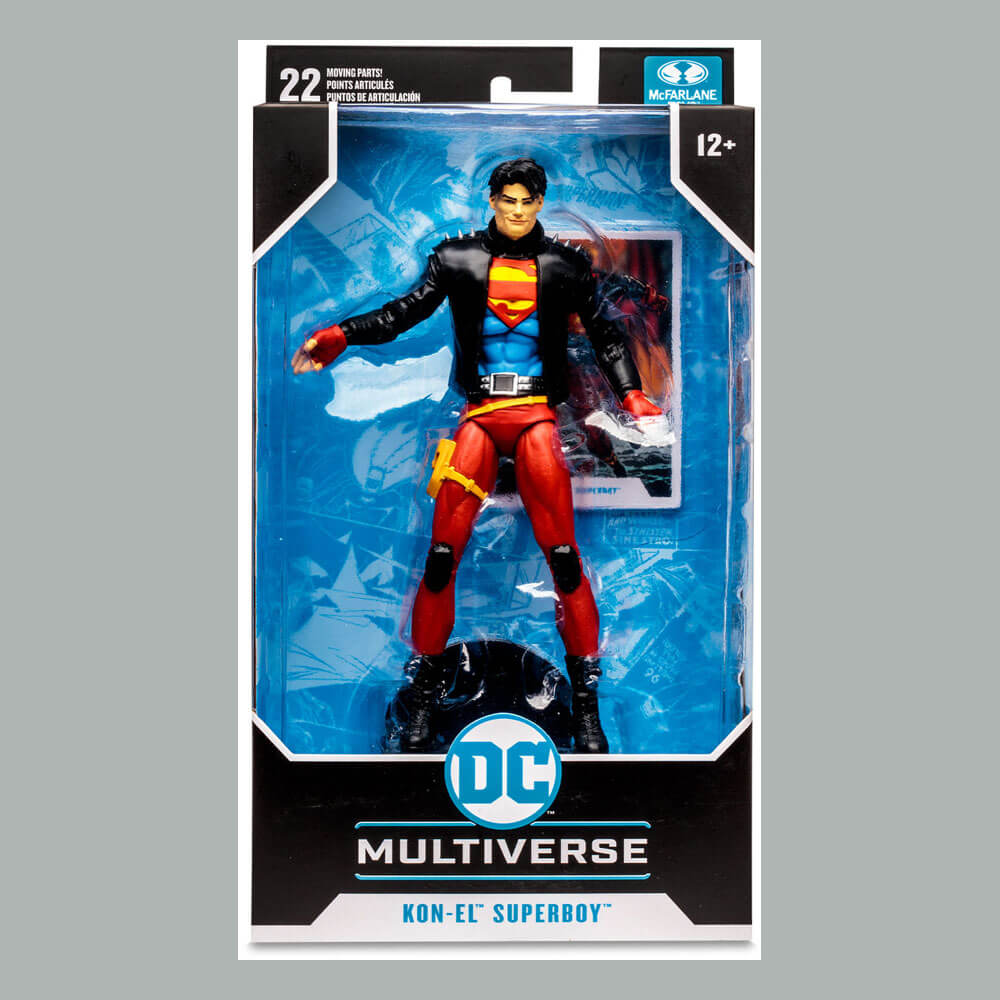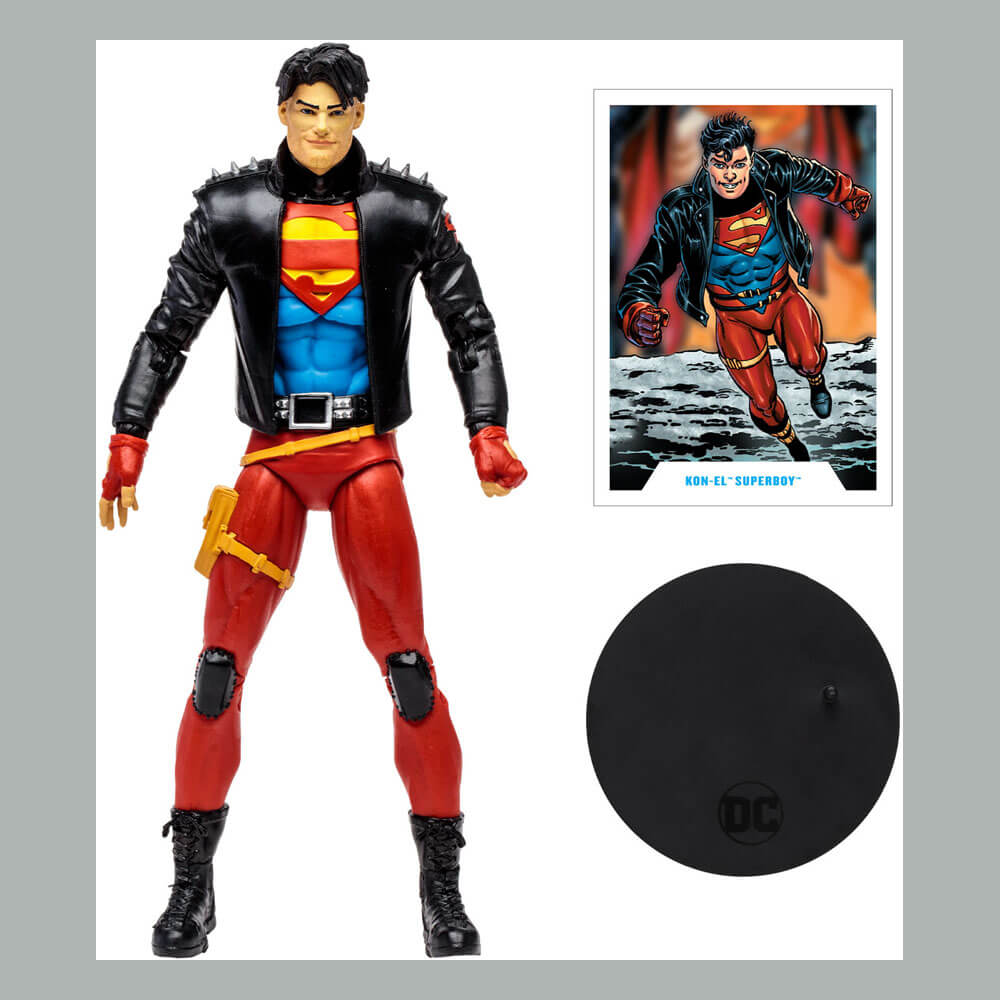 Cloned from Kryptonian and human DNA, and gifted with powerful tactile telekinesis, Superboy possesses abilities similar to that of the Man of Steel. Faster than a speeding bullet, more powerful than a locomotive, able to leap tall buildings in a single bound, Kon-El always strives to live up to the Superman name but constantly questions his ability to do so. Of course, having the shared DNA of Lex Luthor doesn't make it any easier on the young hero, who lives in constant fear of what sort of influence his human side might hide. Incredibly detailed 7" scale figure based off the DC Multiverse. Designed with Ultra Articulation with up to 22 moving parts for full range of posing and play. Kon-El is featured in his classic leather jacket. Figure comes with base. Included collectible art card with figure photography on the front, and character biography on the back. Collect all McFarlane Toys DC Multiverse Figures.