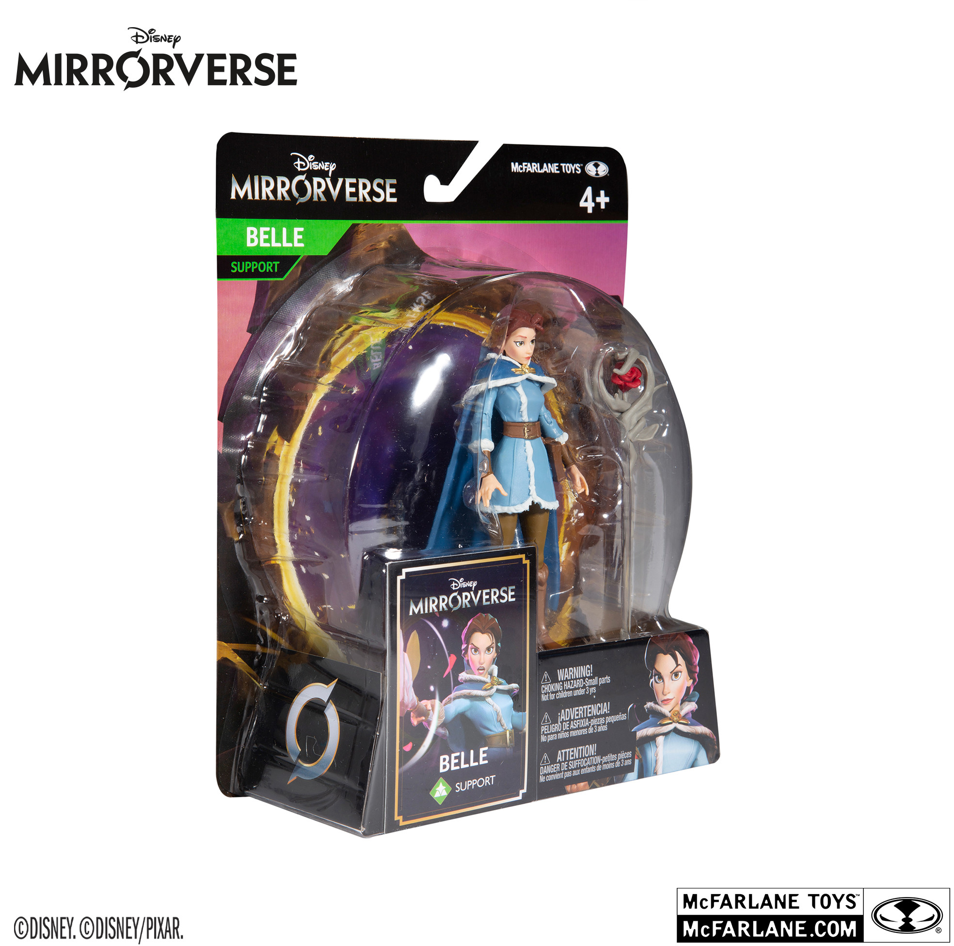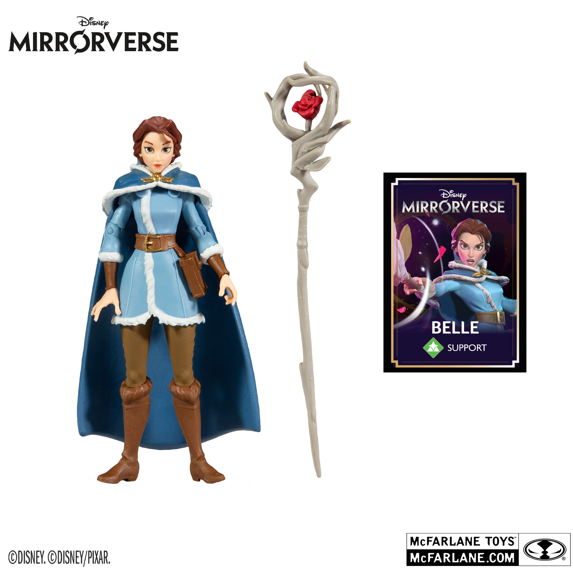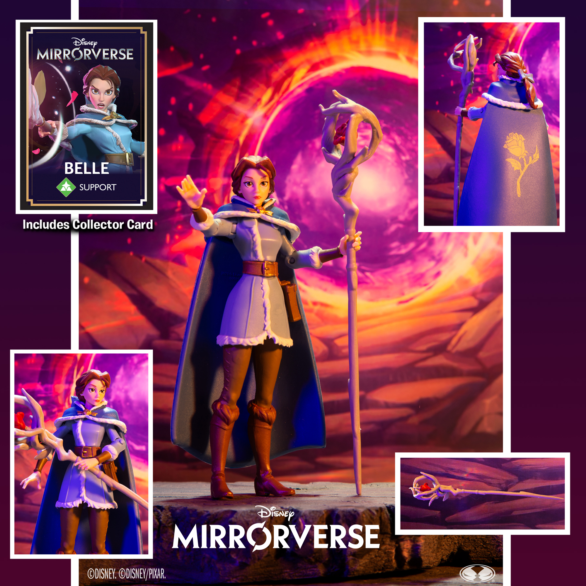 Ca 13 cm hög Belle actionfigur baserad på mobilspelet Disney Mirrorverse. Figuren har upp till 10 rörliga leder och kommer med tillbehör i en blisterförpackning.