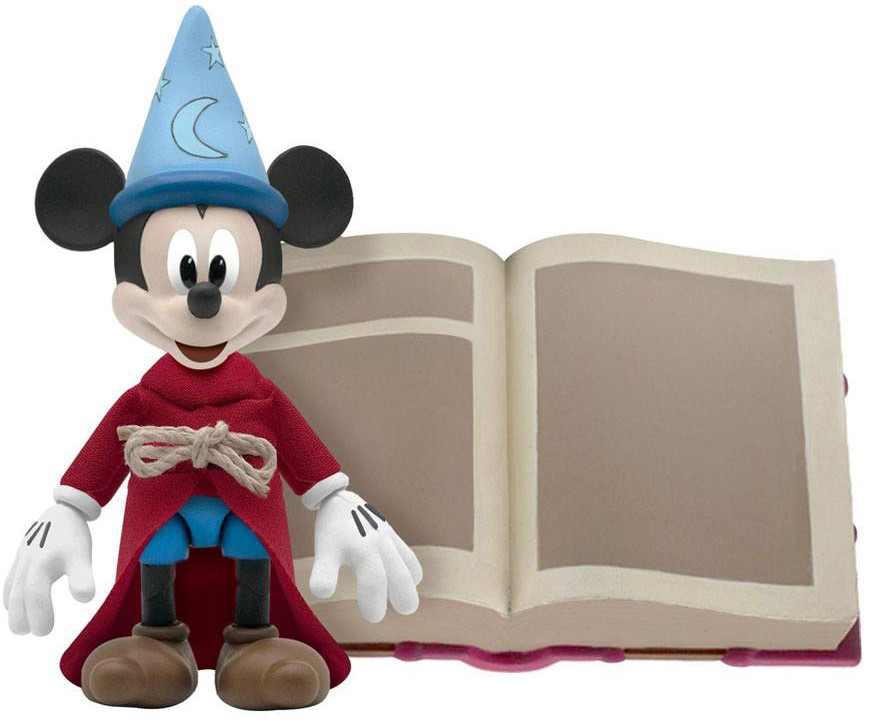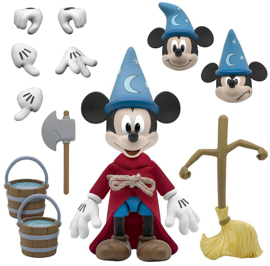 From the timeless animated classic Fantasia comes Disney's Mickey Mouse, in his iconic role as the Sorcerer's Apprentice. This Ultimates! Figure is super poseable and features three interchangeable expressive heads, interchangeable hands, two water buckets, an animated broom, an axe and the Sorcerer's giant spell book. The Ultimates! Figure is also dressed in a tailored, velvety-soft wizard robe with a real rope tied waistband.