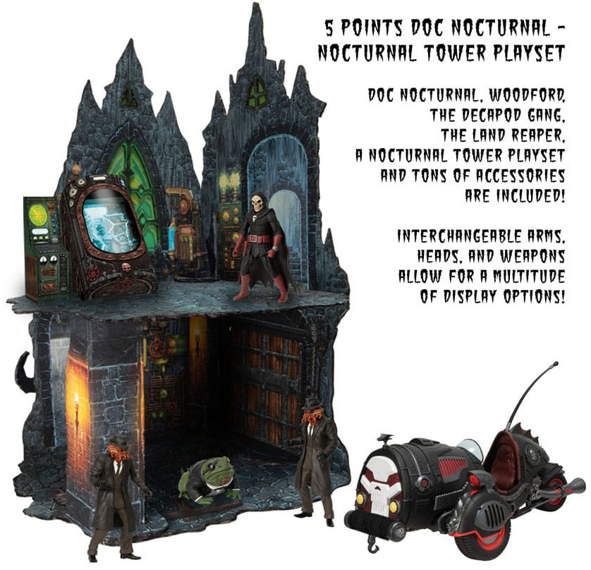 The Nocturnal Tower Playset is a call-back to a time when 5 point articulated figures, vehicles, and large play sets ruled the toy aisles! It contains our heroes, Doc Nocturnal and Woodford, two of the villainous Decapod Gang, and the Land Reaper - Doc's trustly vehicle!