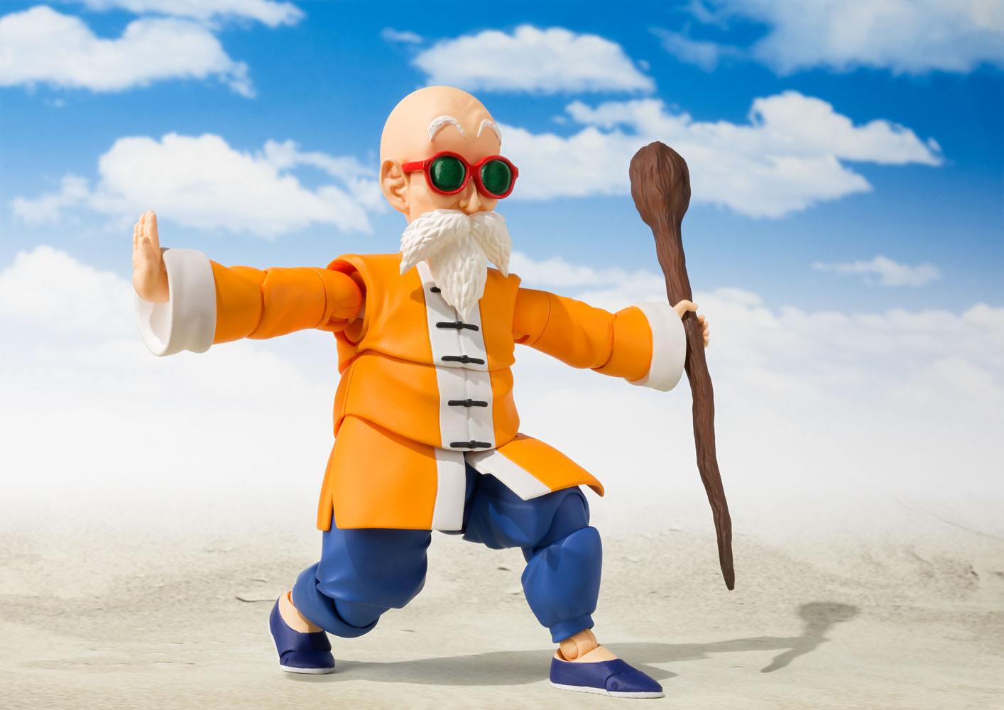 Includes removable shell, four pairs of optional hands, three optional heads (battle, laughing, and without glasses), three optional mouths (closed, open, grinning), a cane, a Dragon Ball (three stars), and a stand.