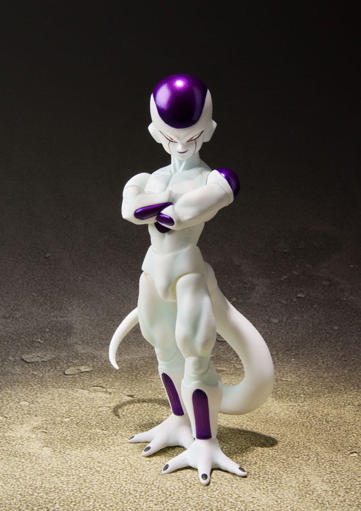 From the anime Dragon Ball Super comes the wild and wildly powerful Frieza! His ancient yet ageless evil charm is captured in this action figure, letting fans replicate famed scenes from the series! The figure includes four pairs of optional hands, one set of optional arms, one set of optional legs, angel's halo, two optional expressions, tail, two effect parts and one effect part stand, plus a custom base (with a plate, support arm, and clip).