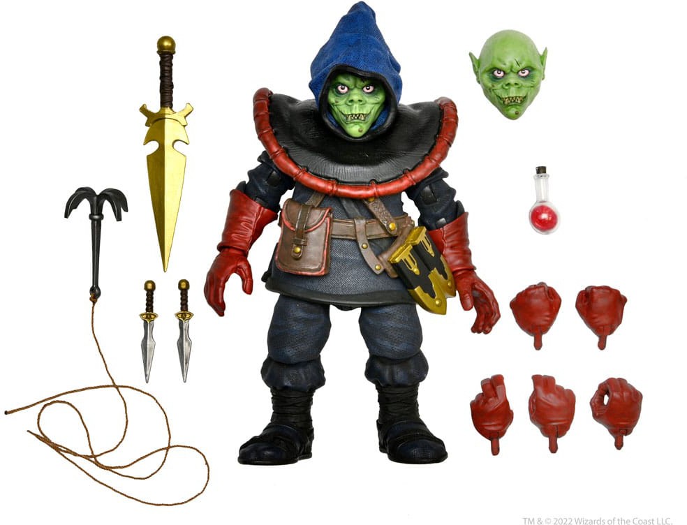NECA has taken inspiration from the classic Dungeons & Dragons action figure releases and reinterpreted them for the modern collector's market, taking advantage of all of today's advances in technology and tooling to create this Ultimate action figure! What evil assassin Zarak lacks in conscience he makes up for in accessories! The figure is packed with an assassin's tools of trade, including sword, daggers that fit into sheaths on his belt, potion bottle, grappling hook with rope, and interchangeable heads and hands.