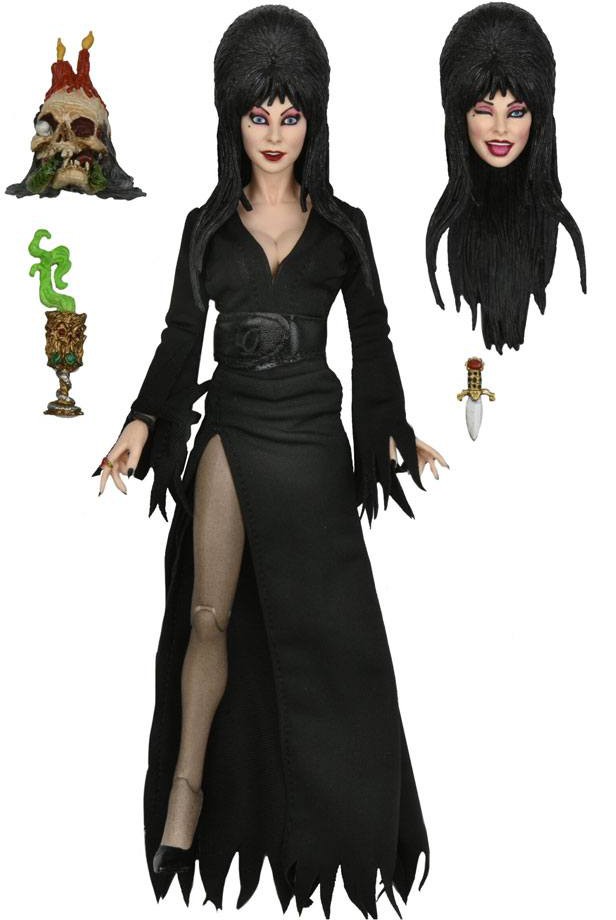 40 år av Elvira, Mistress of the Dark! Den djävulskt förtjusande Cassandra Peterson har spelat rollen som Elvira i 40 år med grace, humor och camp. NECA är stolta över att presentera denna djävulskt fantastiska figur för din skräcksamling. 8-tums actionfiguren Elvira är helt ledad och har skräddarsydda tygkläder, plus massor av tillbehör... utbytbart blinkande huvud, skalle, bägare, figurstativ och hennes signaturdolk, som fästs i en ögla på bältet.