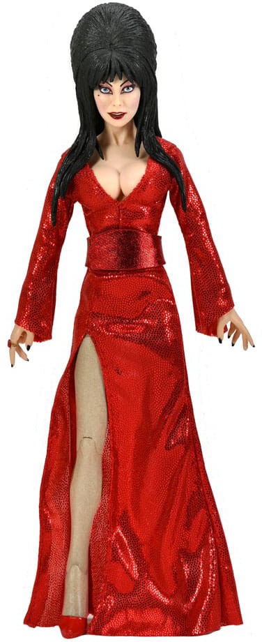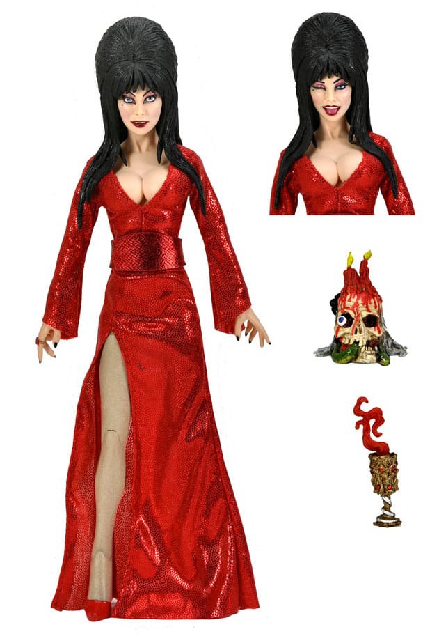 The devilishly delightful Cassandra Peterson has played the part of Elvira for more than 40 years with grace, humor and more than a little camp. NECA is proud to present this positively patriotic figure of the Mistress of the Dark in a sparkling red dress for your horror collection. The 8" Elvira action figure is fully articulated and features tailored fabric clothing, plus plenty of accessories... alternate winking head, skull and snake candle holder, chalice, and figure stand.