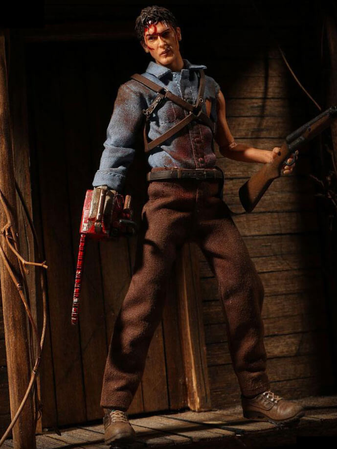 The One:12 Collective Ash figure boasts three head portraits with star, Bruce Campbell's likeness. Authentically presented in his classic ripped blue button-down shirt and brown slacks, Ash sports a meticulously designed shotgun harness. Equipped with his trademark chainsaw hand (groovy!), a sawed-off shotgun, and the Necronomicon (AKA: The Book of the Dead), this figure also includes Ash's severed demonic hand and a decapitated Deadite head.