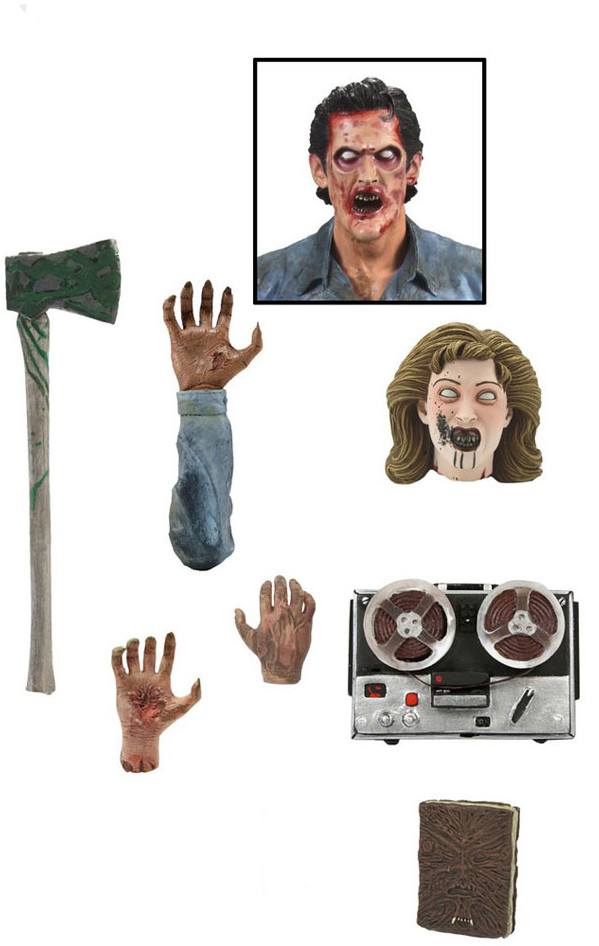 From the 1987 movie starring the one and only Bruce Campbell, we present the definitive collector's version of Ash! Ultimate Ash features all new fully articulated legs and tons of accessories, including 2 interchangeable heads (regular and possessed sculpts), interchangeable right forearms, severed possessed hand, Sheila head, Necronomicon, tape recording machine, shotgun and axe accessories. With over 25 points of articulation, he's fully poseable and ready to rock your world!