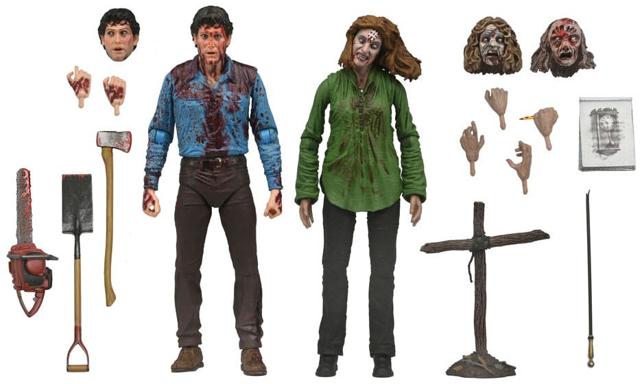 Celebrate the original Evil Dead film that started it all! From the demonically fun 1981 Sam Raimi horror classic, The Evil Dead, NECA presents an action figure two-pack featuring bloody Ash Williams and his possessed sister, Cheryl-for the first time in action figure form! Standing in 7-inch scale, both figures are fully poseable and come with interchangeable heads and hands, including Cheryl's hand holding a pencil and her heads in various states of decay seen throughout the film. Other accessories include bloody chainsaw, axe, shovel, fire poker, sketch pad with clock drawing and Necronomicon drawing parts, and cross grave marker. Comes in collector-friendly, five-panel window box packaging.