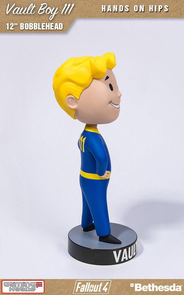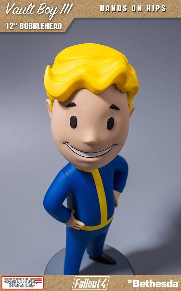 Gaming Heads is proud to reveal their second 12-inch bobblehead in the Fallout series. The Fallout 4: Vault Boy 111 bobblehead Hands on Hips is 30 cm tall and made using high quality PVC to depict the Vault Boy in his Hands on Hips pose. And yes, his head really does bobble. This comes in a full colored window box so you can choose to display him in or out of the box.