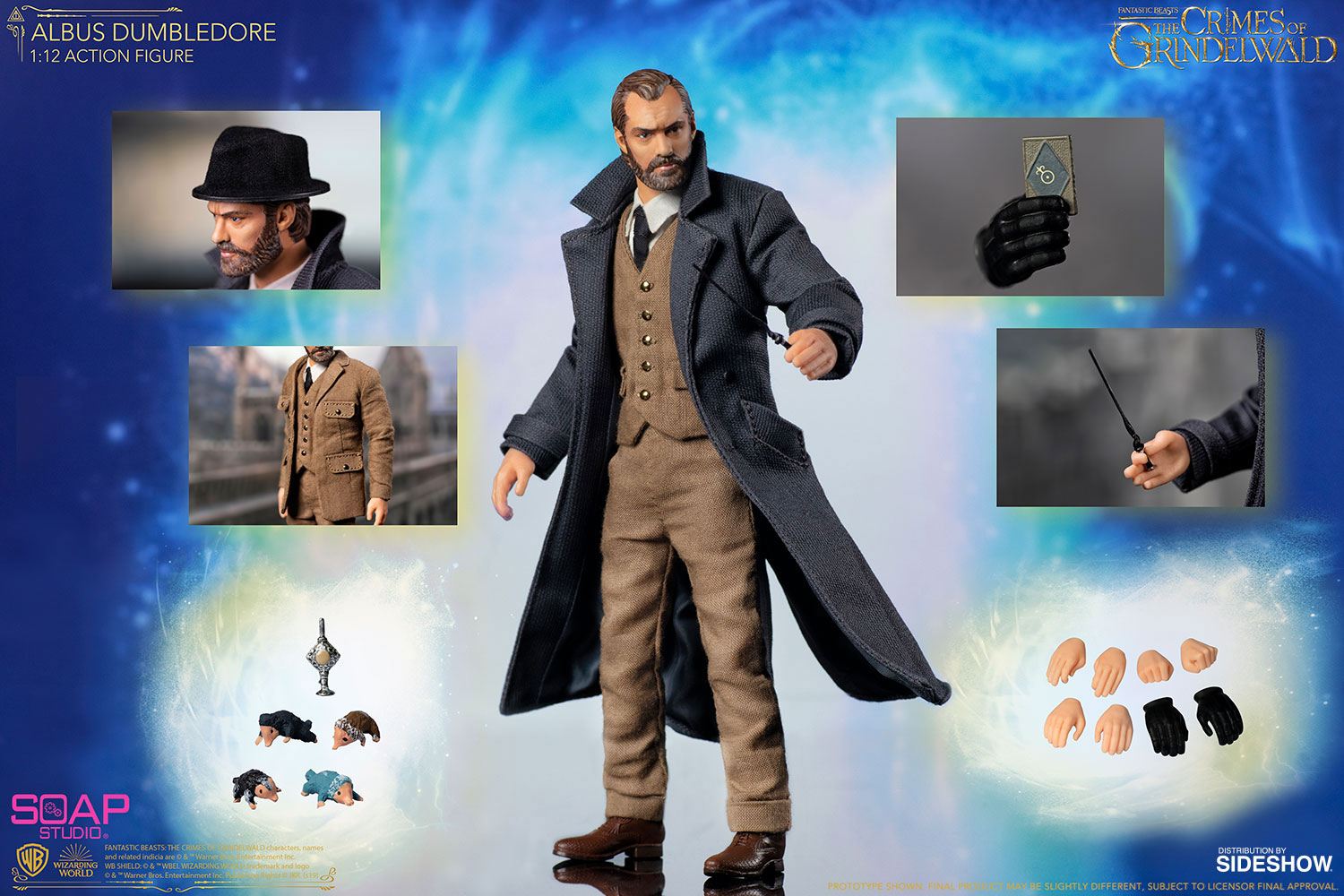 This collectible figure stand approximately 16,4 cm tall, designed after Fantastic Beasts: The Crimes of Grindelwald (2018) characters on-screen appearance with 37 movable joints and highly detailed costumes and accessories! The figure comes with fist hands, relaxed hands, gloves, a business card, blood pact, magic wand, baby nifflers, hat, head sculpt, blazers and coat. To allow players to flexibly build their own "movie stage", a backdrop is also attached to the set. Facial sculpture with high simulation, meticulous painting and clothing made of real fabrics perfectly present the character played by Jude Law!