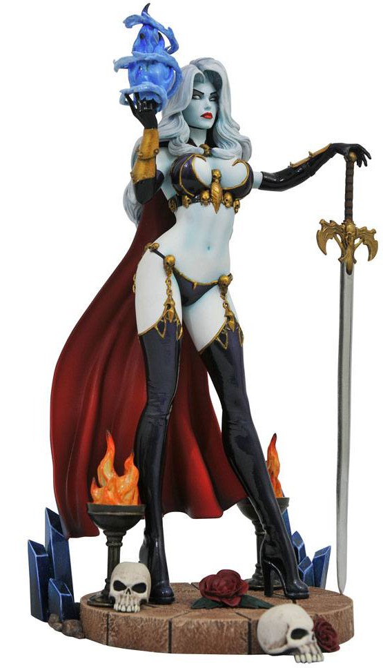 All hail Lady Death! Brian Pulido's creation comes to life in a new Femme Fatales PVC Diorama! Depicting her wielding a ball of blue flaming energy, with one hand resting on a massive broadsword, this 23 cm sculpture is made of high-quality vinyl with exacting paint details and comes packaged in a full-color window box. Sculpted by Sam Greenwell!