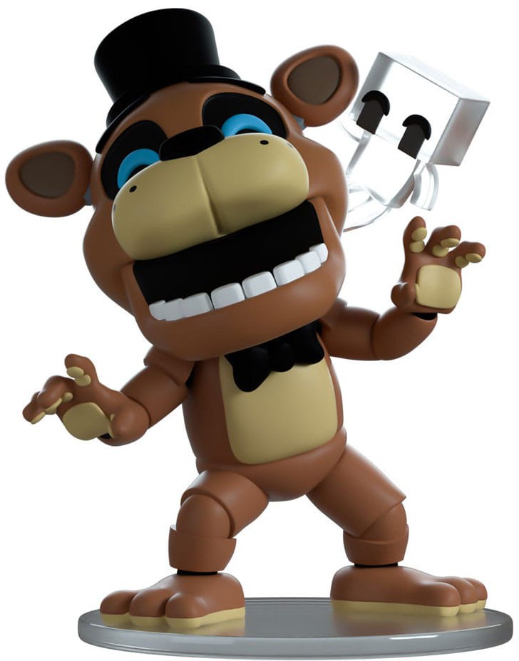 Standing at 4.3 inches and full of pure dread with his arms outstretched as he prepares to flee in terror, a yell escapes from his large open mouth that reveals a single row of bright white teeth. With raised eyebrows and blue pupils that shine out from black sockets, a clear ghost wraps around the side of his head with tear marks running down its face, as a black top hat sits on Freddy's head. The exterior of his packaging shows a ghost escaping from him down a long hallway, while the interior shows the same ghost flying through the vent of the security room. The protective sleeve is a close-up of the pizzeria's wall and displays Freddy's figure through the large clear window at its front. This collectible ships in a matte, embossed, protective outer sleeve and a custom-sized plastic protector for maximum protection during shipping. Youtooz consulted with FNAF Fanverse game creator Kane Carter in the development of the Haunted Collection.