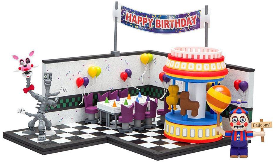 - Construction set features the game area, happy birthday banner, fully functional carousel, party balloons, streamers, decorative balloons and party favors