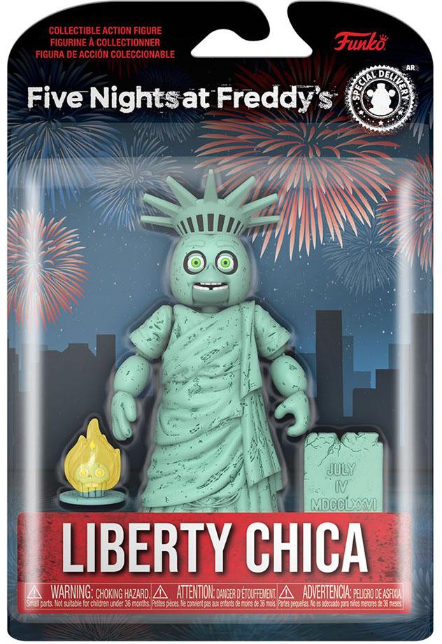 Liberty Chica actionfigur från spelet "Five Nights at Fredy's". Figuren är ca 13 cm hög och kommer med tillbehör i en fönsterkartong.