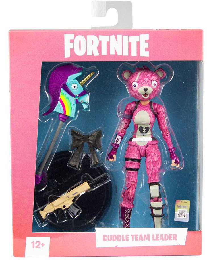 - Cuddle Team Leader is showcased in premium glossy Fortnite-themed window box packaging.