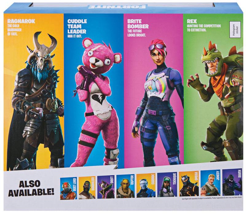 - Ragnarok, Rex, Cuddle Team Leader and Brite Bomber 4" action figures - inspired by four of the most popular outfits from Epic Games' Fortnite.