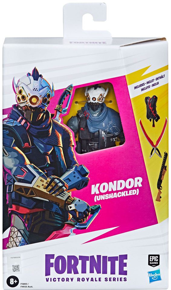 Kondor drops off the Battle Bus and glides into the Victory Royale Series! This 6-inch action figure shows the popular character outfit in his Unshackled style with game-level deco and details. Comes with Oath & Sorrow Harvesting Tools, Spirit's Pact Back Bling, and weapon accessories. Pose out the Kondor (Unshackled) figure in an epic battle stance or bust a move in a dance emote with more than 20 points of articulation!