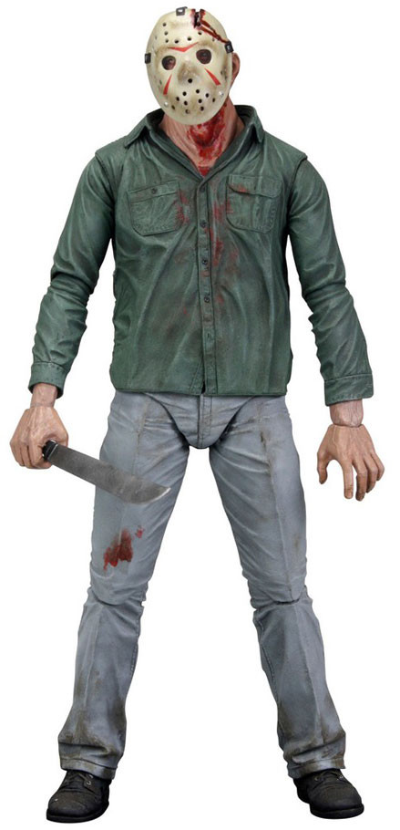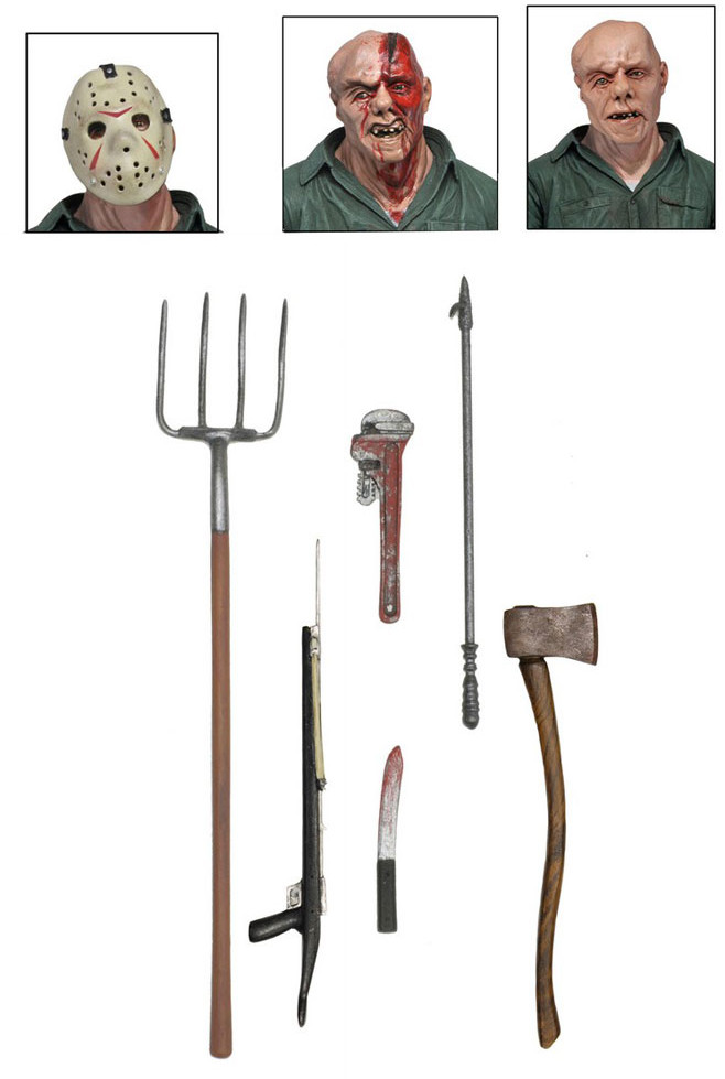 This deluxe 18 cm action figure features over 25 points of articulation and is packed with accessories. It comes with two masks, two interchangeable head sculpts, pitchfork, wrench, knife, fire poker, harpoon gun, machete, and axe. The packaging is deluxe too, with a lenticular front window flap in honor of the film's 3D release!
