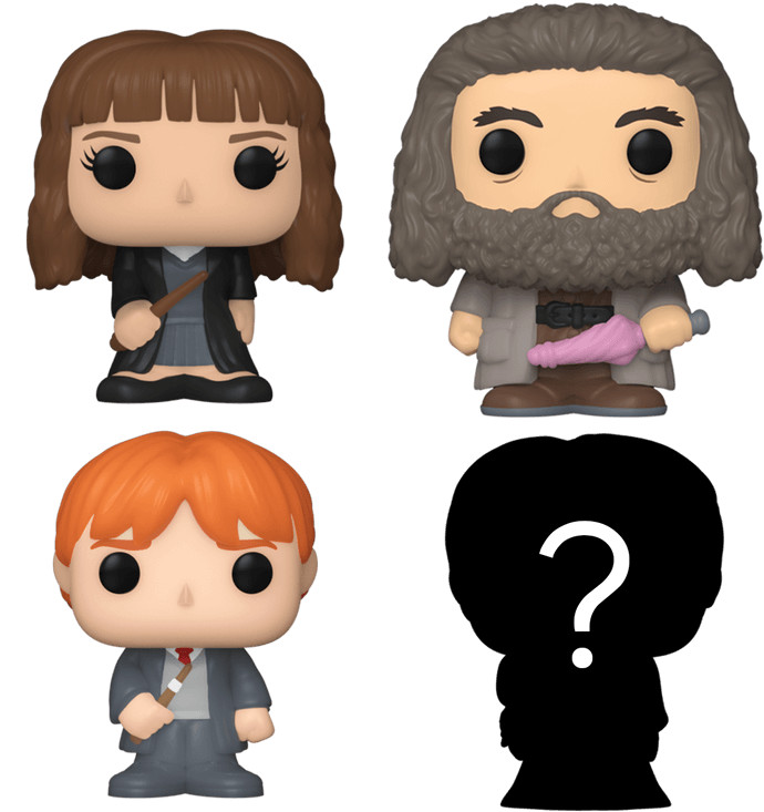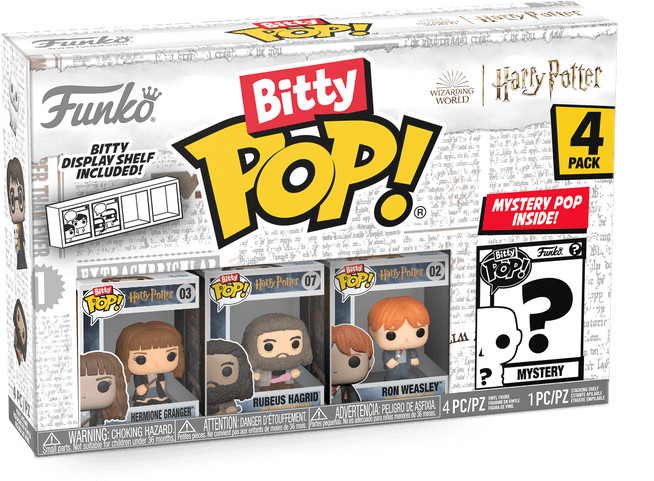 Detta 4-pack innehåller Bitty Pop! Hermione Granger, Bitty Pop! Rubeus Hagrid och Bitty Pop! Ron Weasley, och en mystisk Bitty Pop!-figur. De möjliga mystiska Bitty Pops! figurerna är Hyper Rare (1/6) Harry Potter (Quidditch), Hyper Rare (1/6) Hedwig, Rare (1/3) Fawkes och Rare (1/3) Severus Snape.
