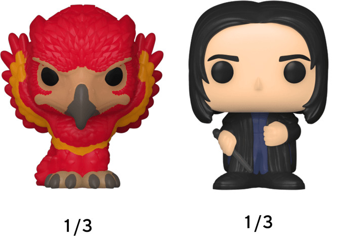 Diminuendo! Your favorite Harry Potter Pops! have been shrunk into Bitty Pops! Expand your Wizarding World collection with this assortment of Bitty Pop! figures featuring your most beloved Harry Potter characters! This 4-pack includes Bitty Pop! Hermione Granger, Bitty Pop! Hermione Granger, and Bitty Pop! Ron Weasley, and a mystery Bitty Pop! figure. The possible mystery Bitty Pops! are Hyper Rare (1/6) Harry Potter (Quidditch), Hyper Rare (1/6) Hedwig, Rare (1/3) Fawkes, and Rare (1/3) Severus Snape.