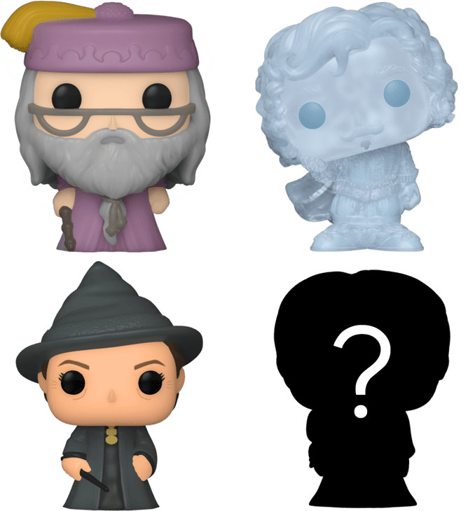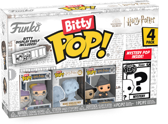 Detta 4-pack innehåller Bitty Pop! Albus Dumbledore, Bitty Pop! Nearly Headless Nick, Bitty Pop! Minerva McGonagall och en mystisk Bitty Pop!-figur. De möjliga mystiska Bitty Pops! figurerna är Hyper Rare (1/6) Harry Potter (Quidditch), Hyper Rare (1/6) Hedwig, Rare (1/3) Fawkes och Rare (1/3) Severus Snape.