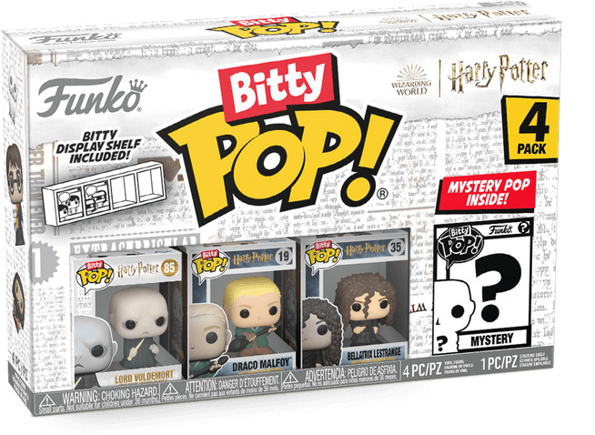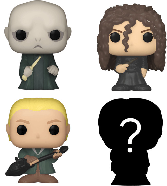 Detta 4-pack innehåller Bitty Pop! Lord Voldemort, Draco Malfoy (Quidditch), Bellatrix Lestrange, och en mystisk Bitty Pop!-figur. De möjliga mystiska Bitty Pops! figurerna är Hyper Rare (1/6) Harry Potter (Quidditch), Hyper Rare (1/6) Hedwig, Rare (1/3) Fawkes och Rare (1/3) Severus Snape.