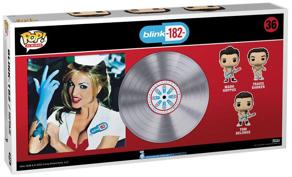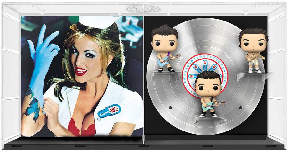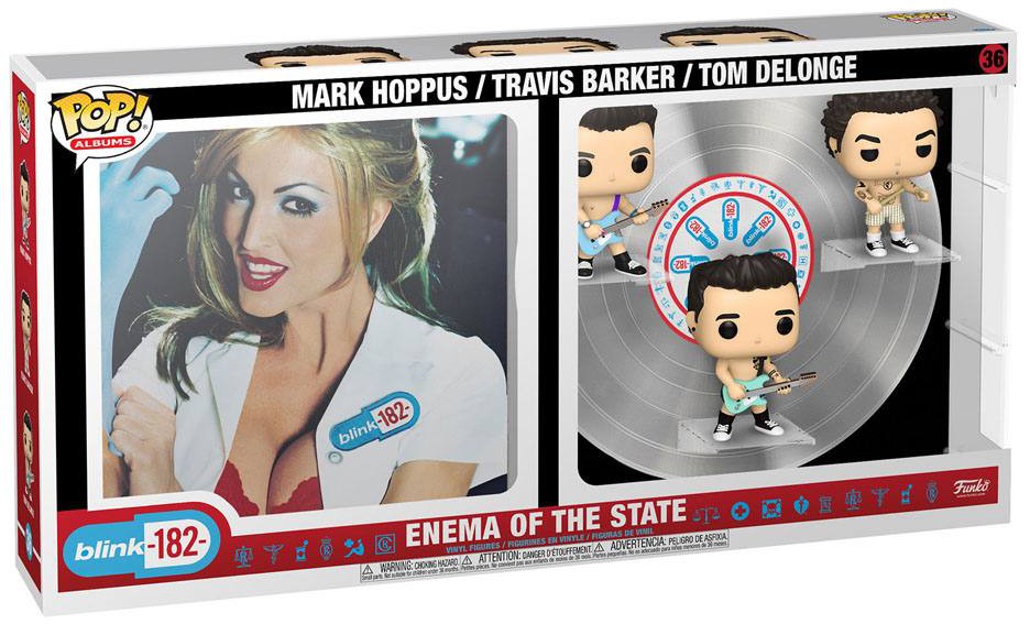 Put a spin on your Pop! Music set with this exclusive Enema of the State Pop! Albums Deluxe collectible. Rock on with Blink-182 Pops! Mark Hoppus, Travis Barker, and Tom Delonge while commemorating the 1999 release of the chart-topping album, Enema of the State. These Pops! stand on platforms around a record-backdrop, and next to them, the cover for Enema of the State is recreated in full color. This unique collectible comes in a prepackaged case that can be hung on the wall or displayed in your music collection.