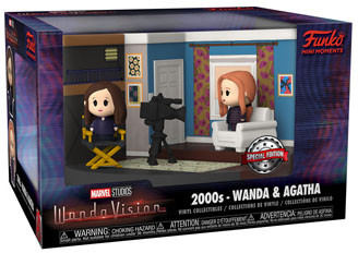 Capture memories with this exclusive Marvel Wanda & Vision 2000s Pop! Mini Moment. Enter Wanda & Vision's living room, which seems to be the host of a television broadcast. Mini Wanda and Mini Agatha are seated in the living room ready to start rolling. Go behind the scenes and solve the mysteries in your Marvel WandaVision set by collecting Mini Moments. Vinyl figures are approximately 1.5-inches tall, while set piece is approximately 3.75-inches tall and 5.25-inches wide.