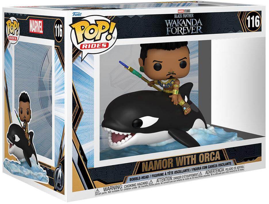 This Black Panther: Wakanda Forever Namor with Orca Pop! Vinyl Ride measures approximately 3 3/4-inches tall. Comes packaged in a window display box.