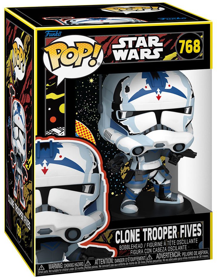 Var vänlig ställ din fråga om produkten "Funko POP! Star Wars: Clone Wars - Clone Trooper Fives (Retro)" nedan, så svarar vi så snart som möjligt!