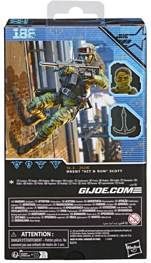 Ny i G.I. Joe Classified Series är Brent “Hit & Run” Scott, redo för uppdrag med många rörliga leder för hög poseringsförmåga. Figuren innehåller 10 tillbehör inspirerade av karaktären, inklusive änterhake, handtag till änterhaken, machete, duffelväska, kniv, hjälmglasögon och flera vapen.