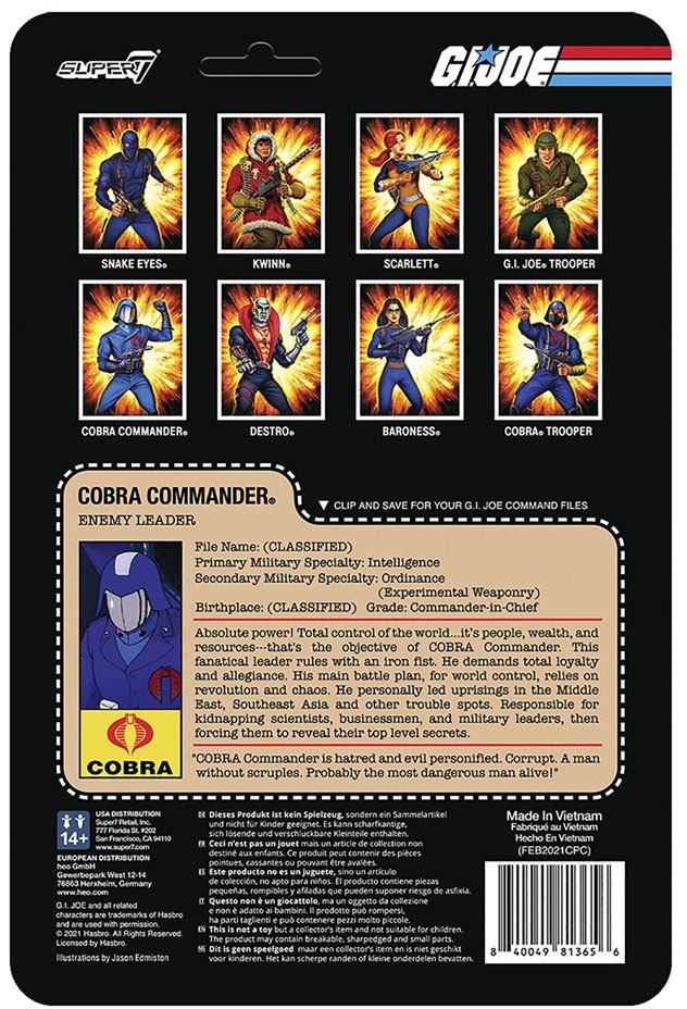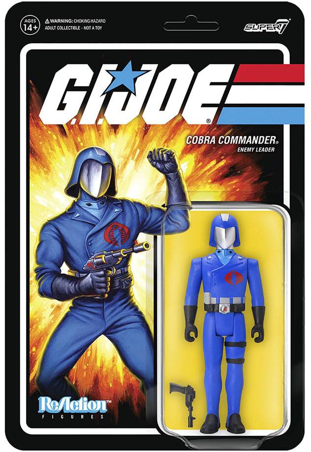 Even more crazy than he is evil, Cobra Commander is never at a loss for outlandish schemes for world domination! This 3.75" articulated G.I. Joe ReAction figure of Cobra Commander comes with laser pistol accessory and will immediately call to mind his unforgettable raspy, shrill voice. He's perhaps the most iconic of all the G.I. Joe characters so you'd have to be even crazier than he is not to add the Cobra Commander ReAction figure to your collection.