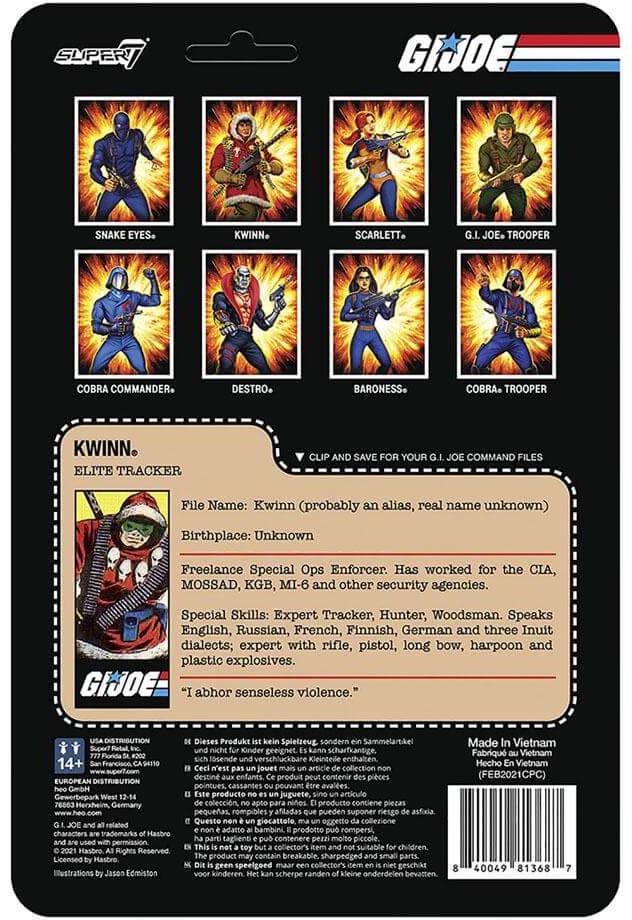 While not their inherent enemy, as a mercenary for hire, Kwinn is often a thorn in the side of G.I. Joe. Although sworn to uphold the letter of his contracts, his strict sense of honor has saved the Joes on more than one occasion. This 3.75" articulated G.I. Joe ReAction figure of Kwinn is an imposing figure featuring his weasel skull necklace and comes with gun and bandolier accessories. One of the physically strongest characters in the G.I. Joe universe, your collection will undoubtedly be weaker if you don't add the Kwinn ReAction figure!