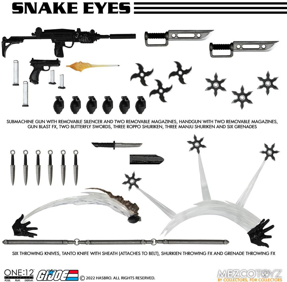 Snake Eyes deluxe One:12 actionfigur. Figuren är ca 17 cm hög och kommer med flera vapen och tillbehör. Dessutom inkluderas Timber, Snake Eyes varg. Kommer med tre utbytbara huvuden och flera rörliga leder.