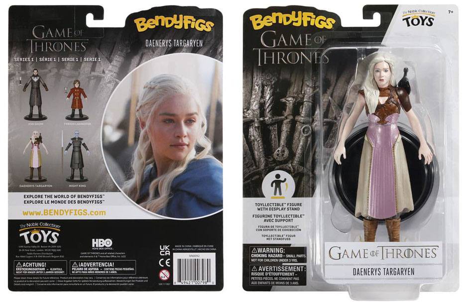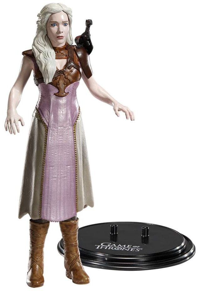 Daenerys Stormborn of House Targaryen, the First of Her Name, Queen of the Andals and the First Men, Protector of the Seven Kingdoms, the Mother of Dragons, the Khaleesi of the Great Grass Sea, the Unburnt, the Breaker of Chains. This approximately 7.5 inch/19 cm Bendyfig comes with the baby dragon, Drogon.