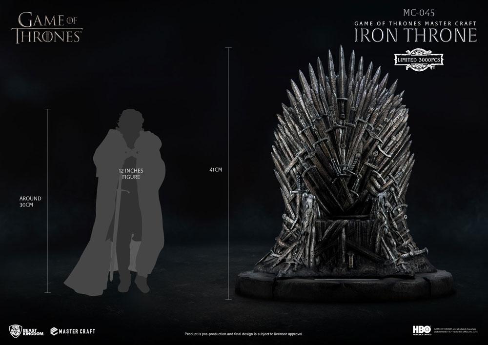 Beast Kingdoms "Entertainment Experience Brand" har väckt liv till den ikoniska tronen från serien med Game Of Thrones iron Throne under Master Craft-serien av handskulpterade och målade mästerverk. Detaljnivån som visas för de unika spikarna, hullingarna och svärden är exceptionell. Genom att använda åldringseffekter i färgprocessen kan noggrannheten i rosten verkligen skina igenom. Denna Master Craft iron throne är begränsad till 3 000 exemplar över hela världen.