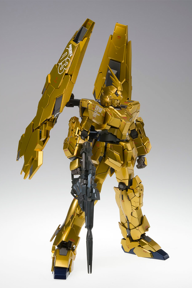 The pinnacle of Gundam Unicorn design variations, the “golden phoenix”, has arrived! Introducing the latest edition to the prestigious GFFMC line, the Gundam 03 Phenix. For an additional sense of depth and luxury, Phenex is finished with the same pearlescent IRIS plating as Banshee Norn. A high-gloss gold is also used to highlight parts of the armor. Additionally, the head and antenna have been completely remolded. Phenix can also be posed in either Unicorn or Destroy Mode. Set includes interchangeable hands (x6), beam magnum, saber (x4), beam saber katana (x2), energy pack type (x2), armed armor DE (x2), and special display stage.