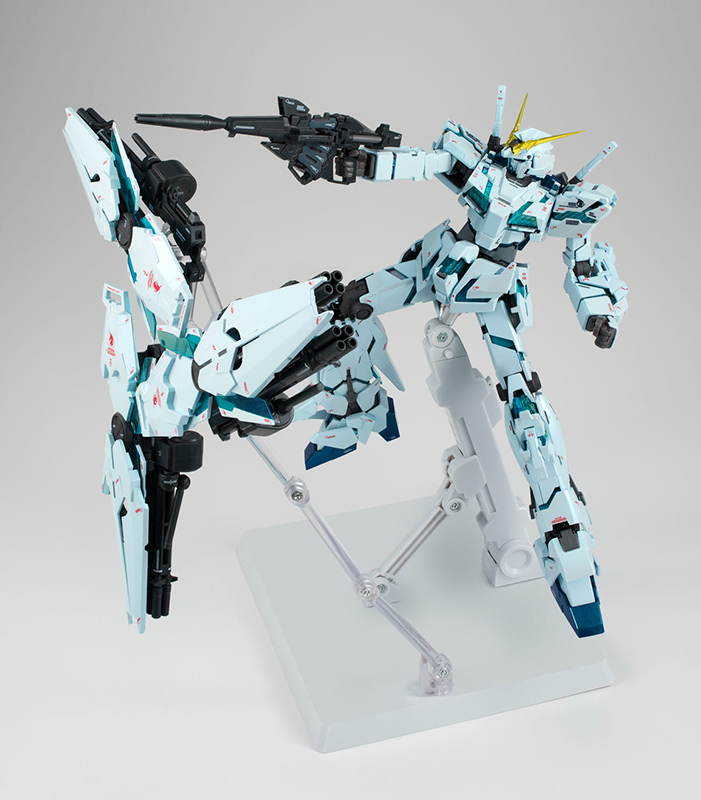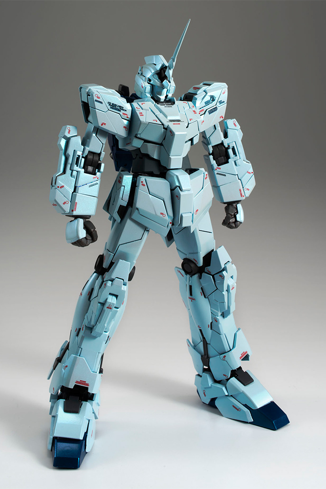GFFMC Unicorn Gundam (Final Battle Ver.) is joining the line up in tribute to the airing of Mobile Suit Gundam Unicorn RE: 0096 completed meticulously in the final battle design. In true GFFMC style, the unique pearlescent IRIS finish is used throughout the impressive psycho frame. New joint make it possible to re-create the memorable shield funnel pose from the anime. Set includes interchangeable hands (x8), beam magnum, hyper bazooka, beam gatling gun (left and right x 3), shield (x3), shield funnel gatling joint parts (x3), shield funnel joint parts, beam saber (x2), display stage set, and stand.