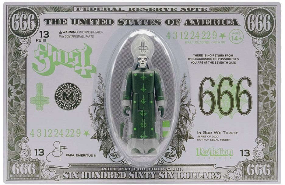 Arriving to corrupt humanity is this special edition Papa Emeritus III ReAction Figure! It comes on a recreation of a Mummy Dust dollar bill card back and comes with a microphone and a stack of Mummy Dust bills as accessories.