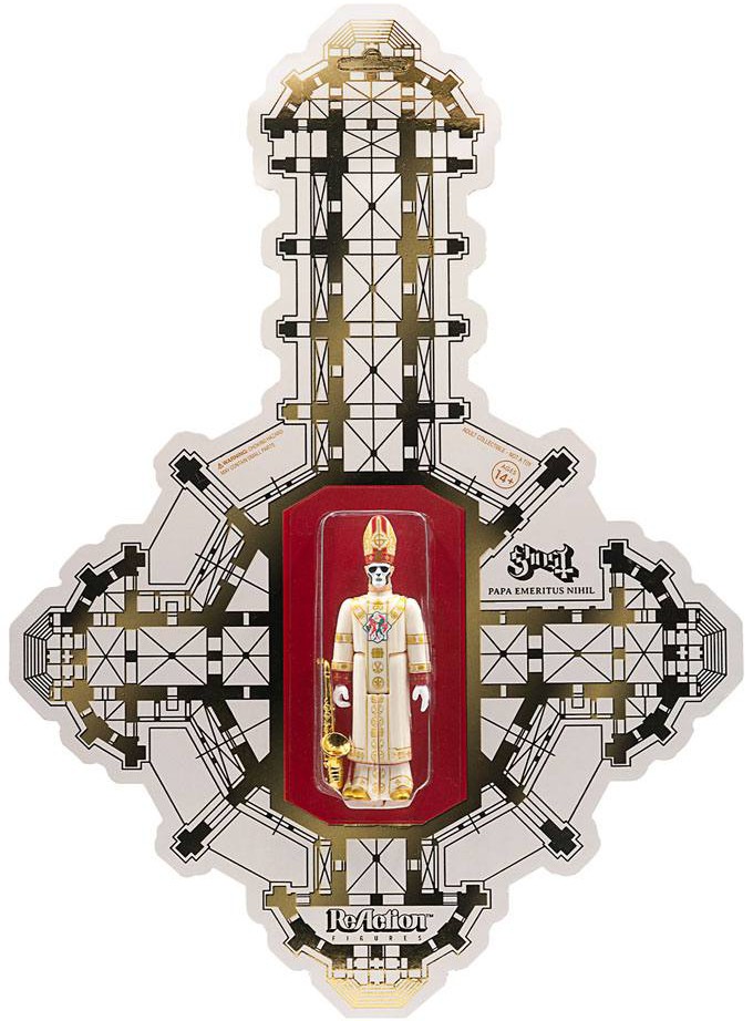 The First Papa of the Dark Ministry makes his action figure debut as a 3.75" ReAction Figure! Relive all the excitement from Ghost's A Pale Tour Named Death as Papa Emeritus Nhil arrives with his signature sunglasses and saxophone, and packaged on a gold-foil stamped Grucifix cardback.