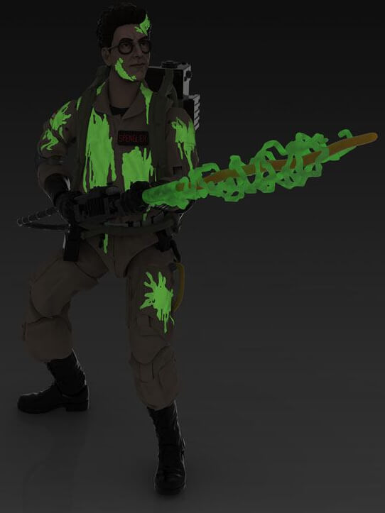 GLOW-IN-THE-DARK FIGURE: This Egon Spengler action figure features glow-in-the-dark ecto-plasm deco for that supernatural "slimed" look. To charge glow-in-the-dark effect, place under light