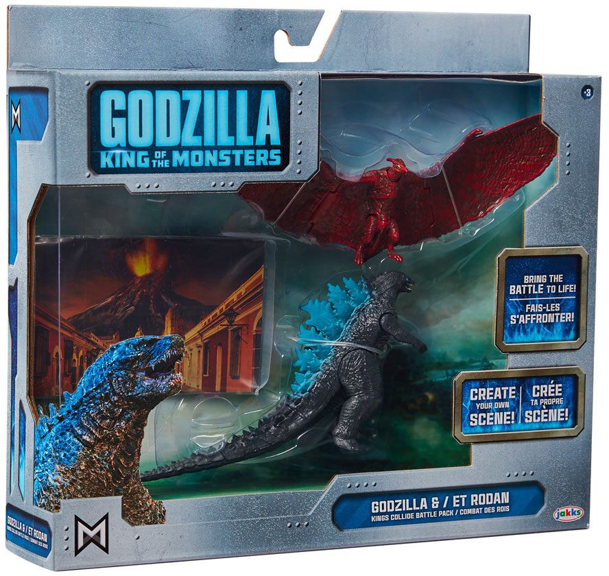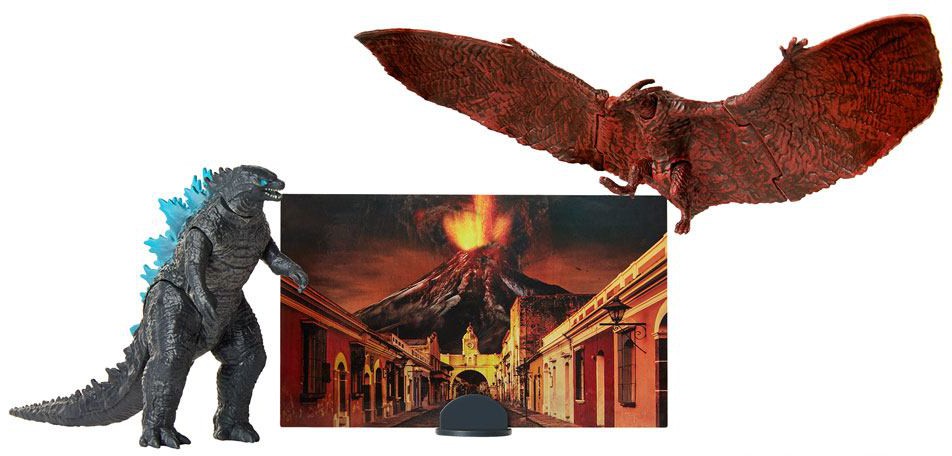 Two Godzilla action figures and a backdrop diorama. Each figure stands approx. 9 cm tall and comes in a window box packaging.