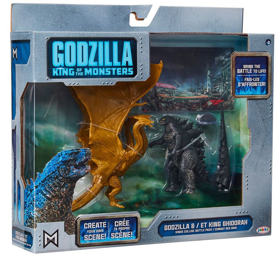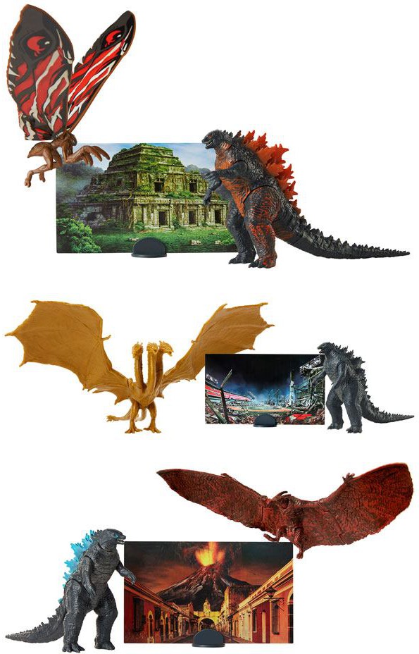 Two Godzilla action figures and a backdrop diorama. Each figure stands approx. 9 cm tall and comes in a window box packaging.