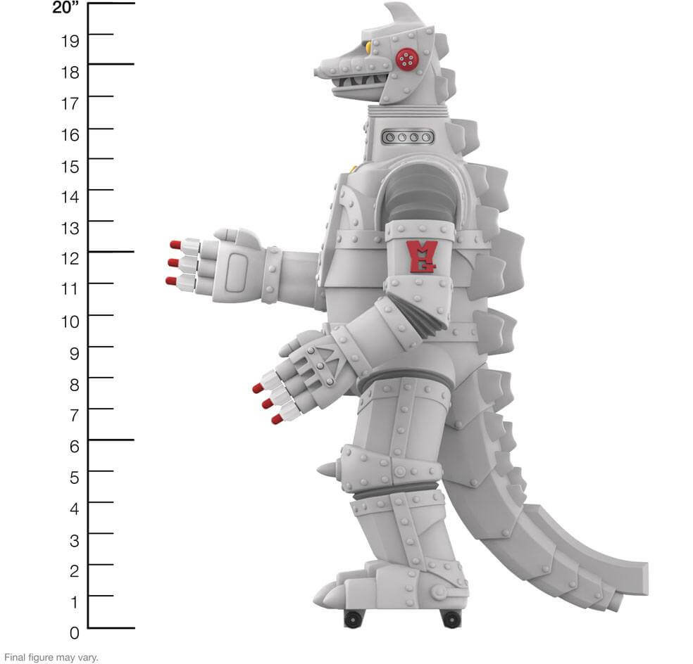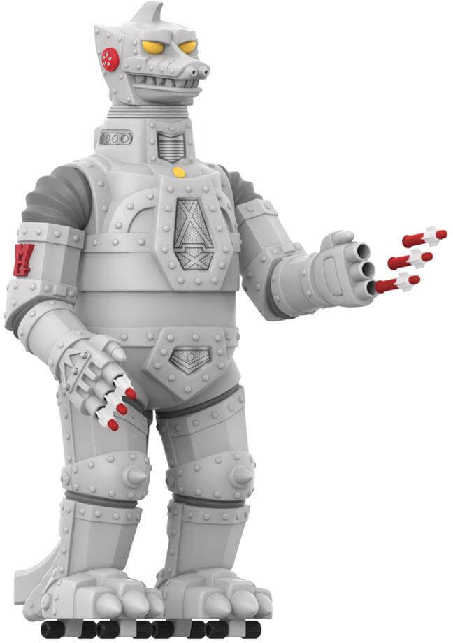 Standing 20" tall, Super7's Super Shoguns are the next evolution of the Jumbo-scale toys popular in the 1970s and 80s. Here to do battle with your vintage Godzilla, this Toho Super Shogun Mechagodzilla features three missile-firing fingers on each hand (six total!) with the iconic original red missiles, movable arms, legs, hands and head, along with wheels on the feet for that perfect vintage touch. Which monster of mayhem will win the battle? Only you (and Mechagodzilla) can decide!