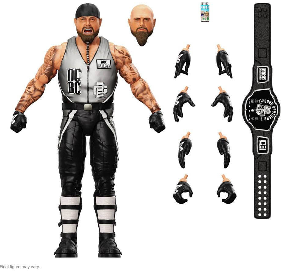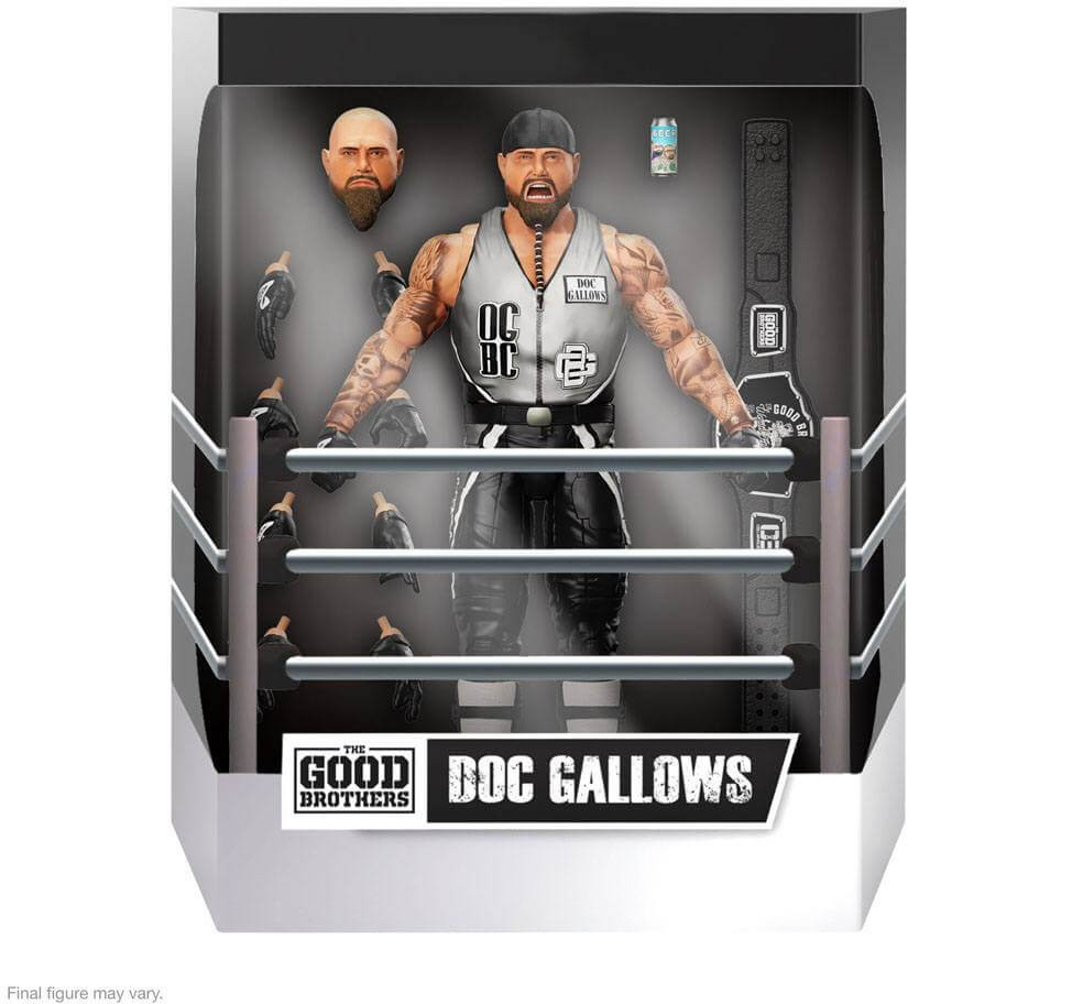 Denna 7-tumsskaliga Doc Gallows ULTIMATES!-figur inkluderar flera utbytbara huvuden och händer, en ölburk och ett Good Brothers titelbälte.